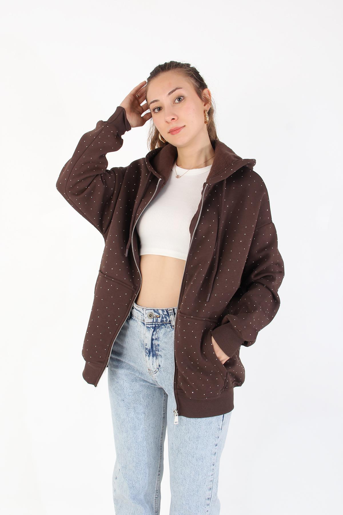 26174 Taşlı Fermuarlı Kapşonlu Kanguru Cep Sweat