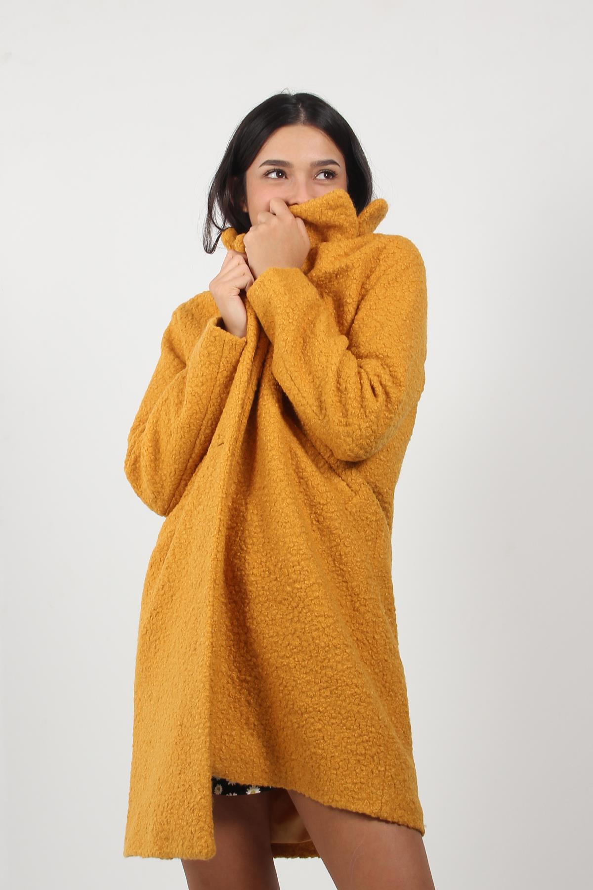 9082 Yakalı Tek Düğme Çift Cep Buklet Kaban