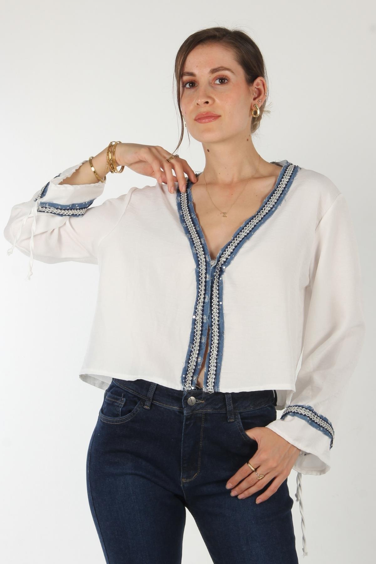 F1888 Kolları Büzgülü Kol Ve Yaka Kot Pul İşlemeli Bluz